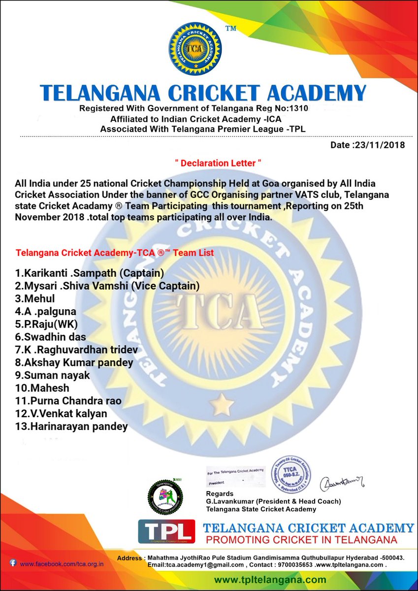 Telangana Cricket Academy On Twitter Telangana State Cricket Academy Team Declaration Telanganaassemblyelections2018 Telanganawithkcr - Hyderabad cricket association is the governing body of the cricket activities in the hyderabad and other districts in the state of telangana in india and the hyderabad cricket team.